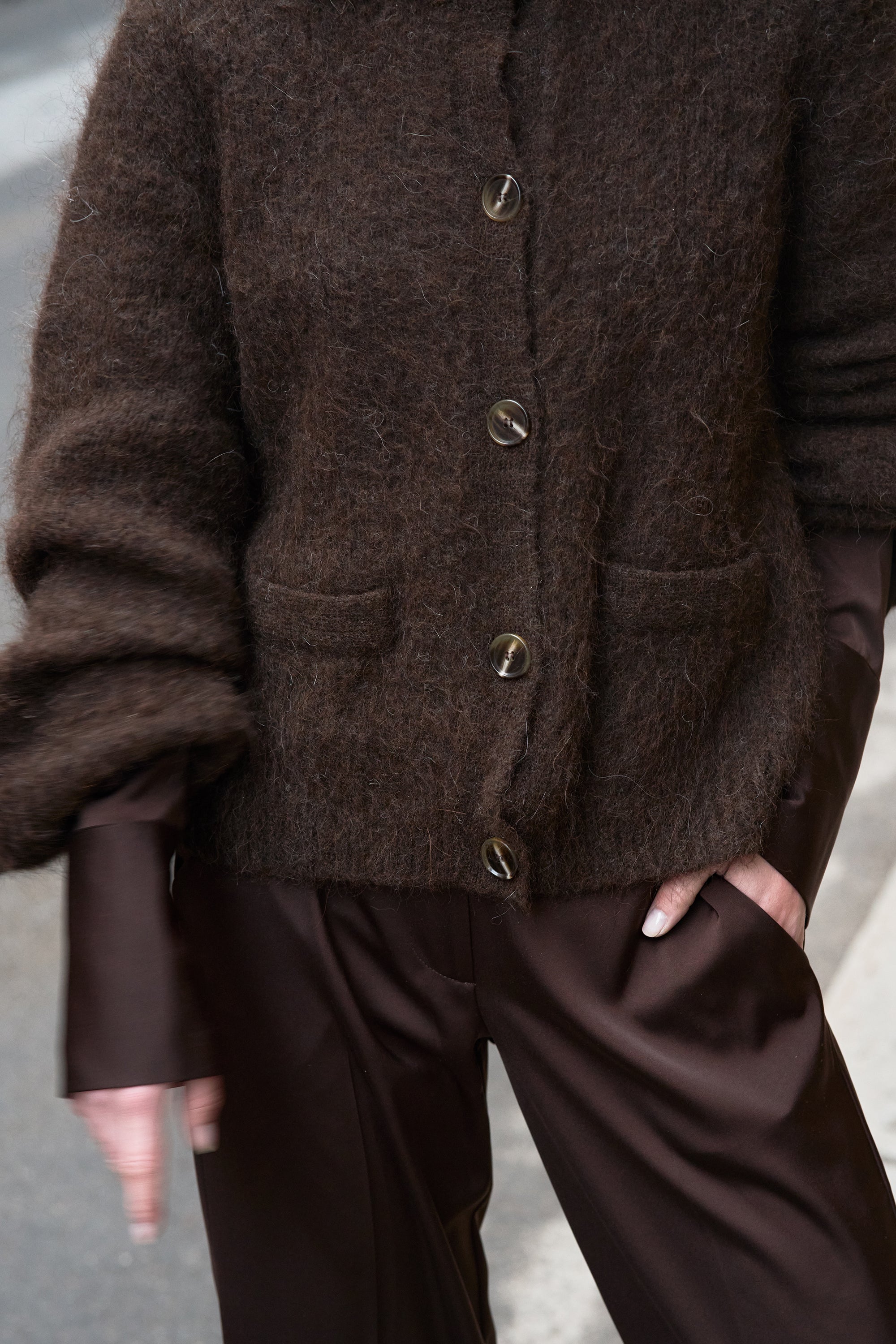 Weiches Volumen mit strukturierter Oberfläche. Der Madeleine Cardigan ist aus supersoftem Alpaka gestrickt und verfügt über einen Rundhalsausschnitt, weite Ärmel und aufgesetzte Taschen vorne. Ein müheloses Kleidungsstück mit subtiler Struktur – tragen Sie ihn offen oder geschlossen, geschichtet oder leicht.