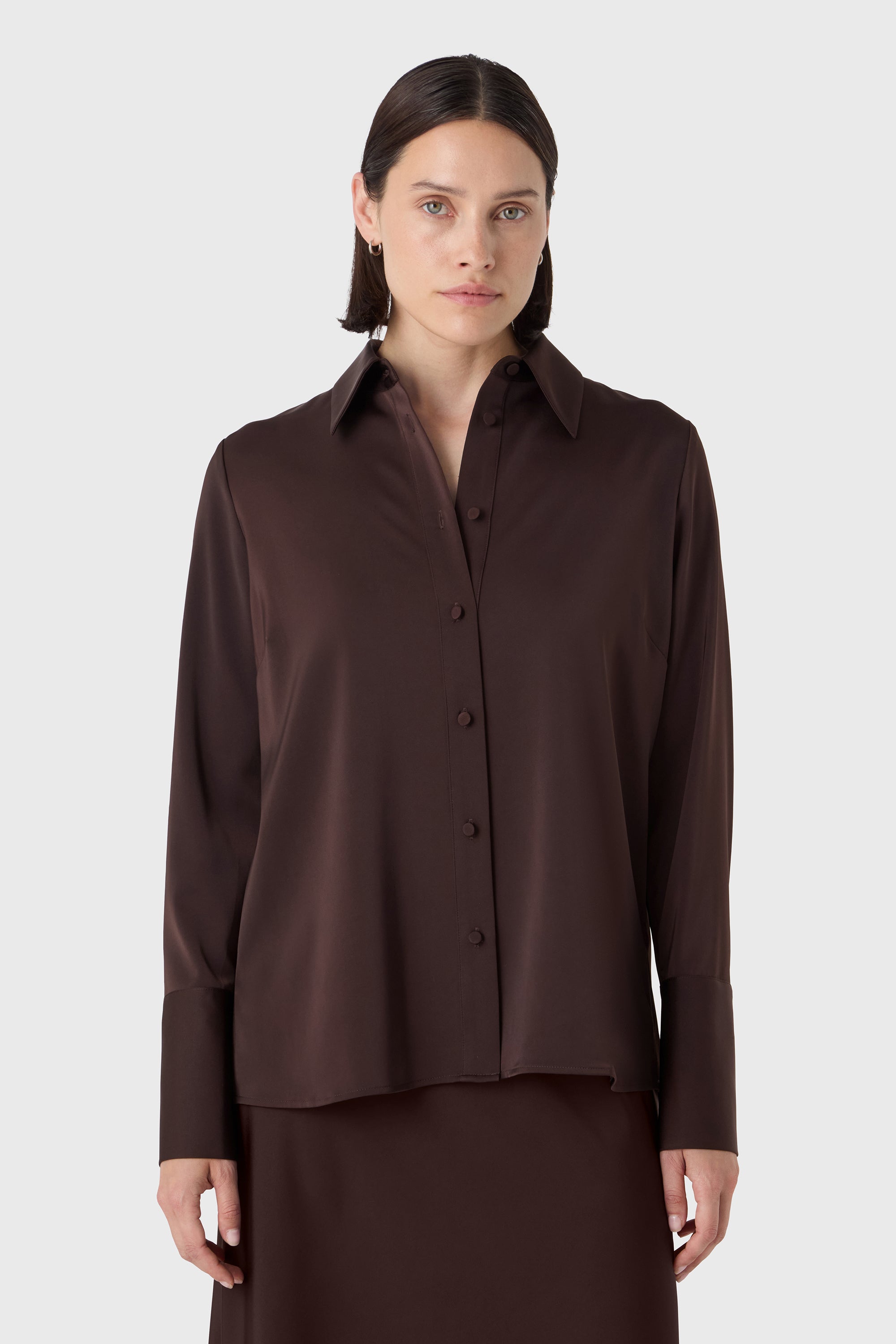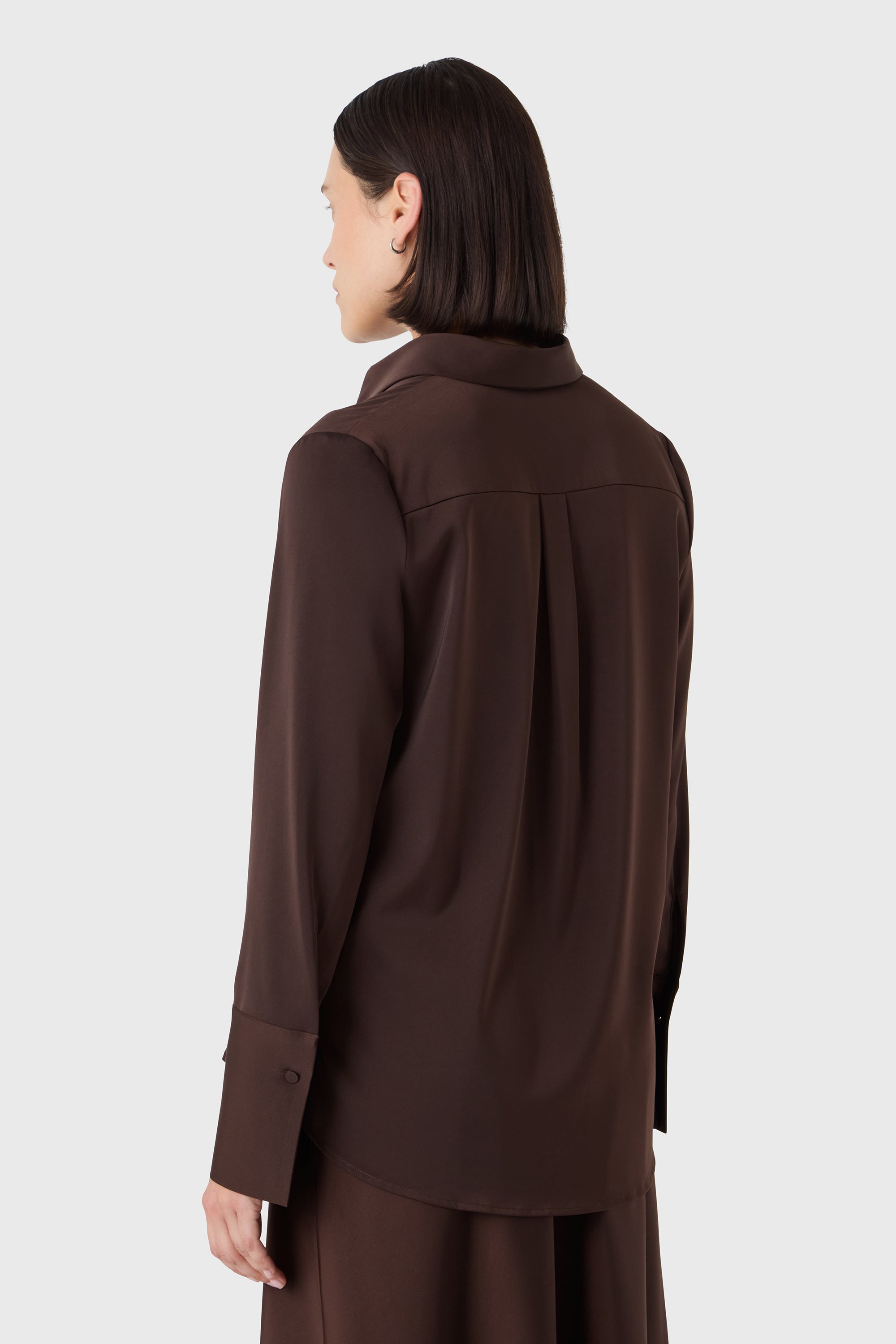 Structure douce avec une touche de brillance. La blouse Leonie est une interprétation féminine de la chemise classique — conçue en satin stretch avec des manches longues, des poignets décoratifs et des boutons recouverts de tissu. Une pièce élégante qui s'associe facilement avec un pantalon tailleur ou des tricots doux.