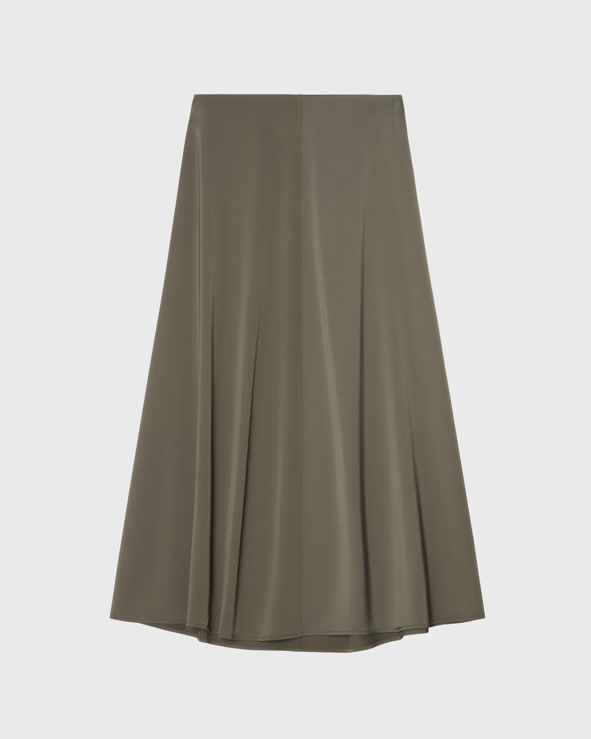 The Rhonda Satin Skirt is an ankle-length skirt in satin stretch with a softly draped silhouette. A subtle front seam adds a clean, refined expression. Pair with the matching Mia Satin Top for a cohesive look, or style with a simple tank for understated ease.