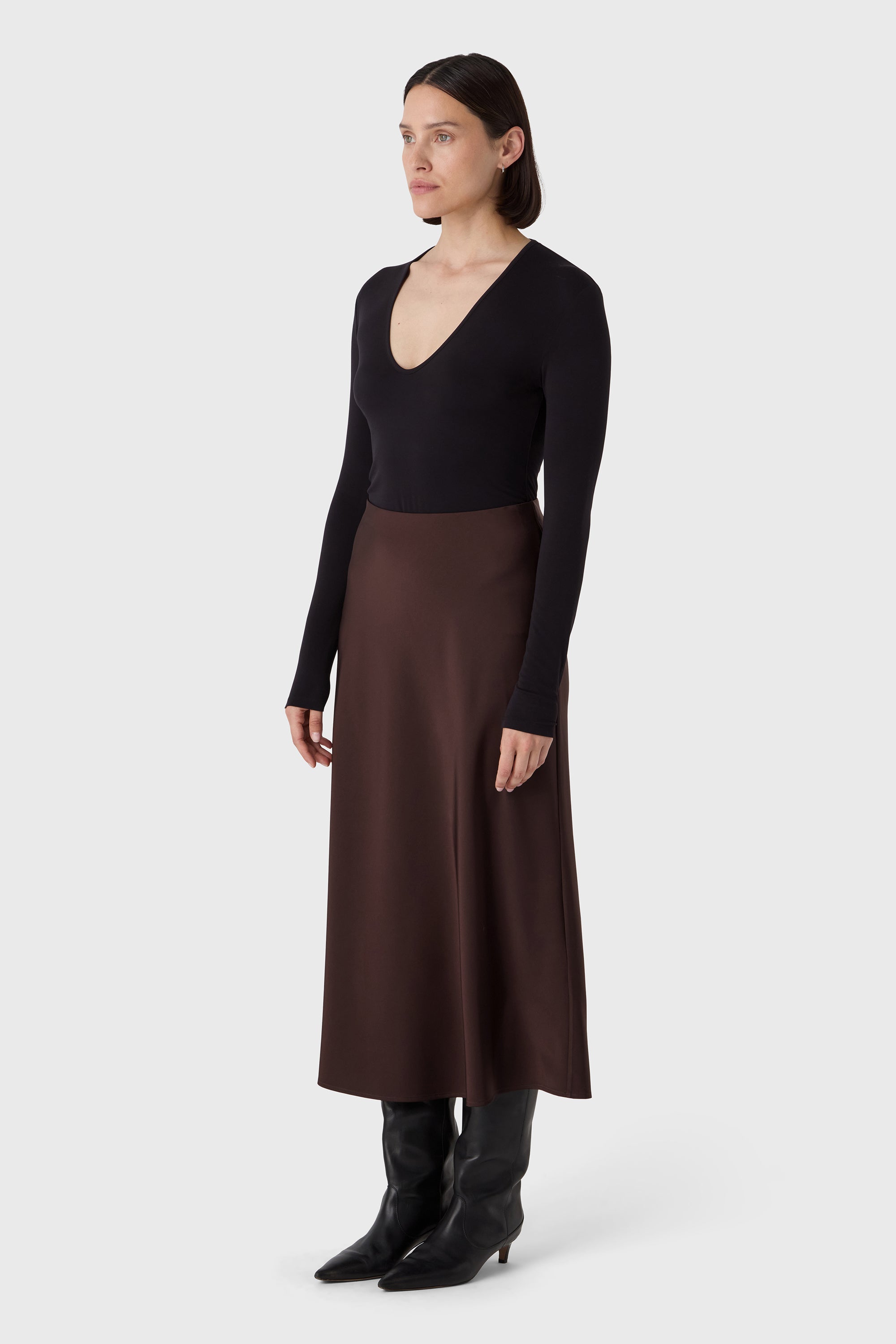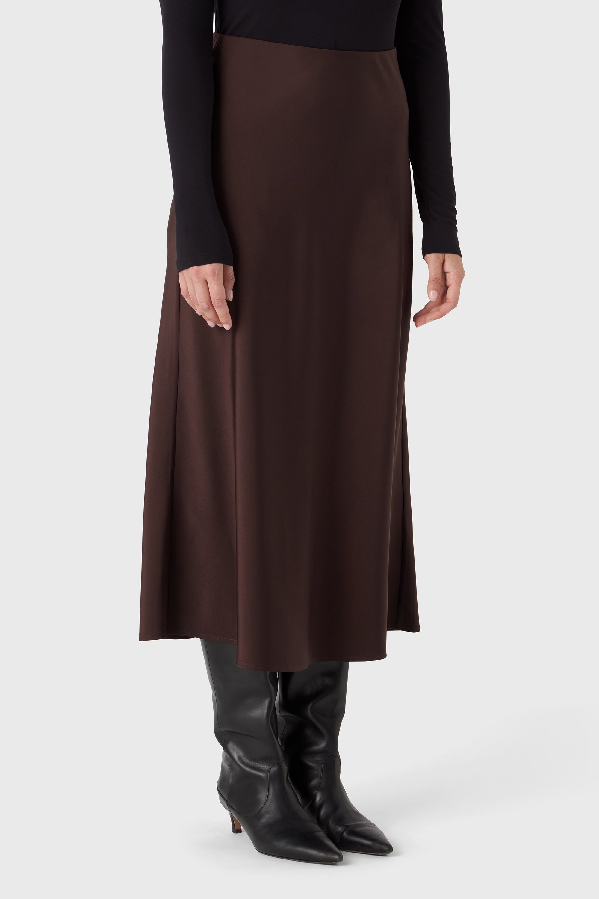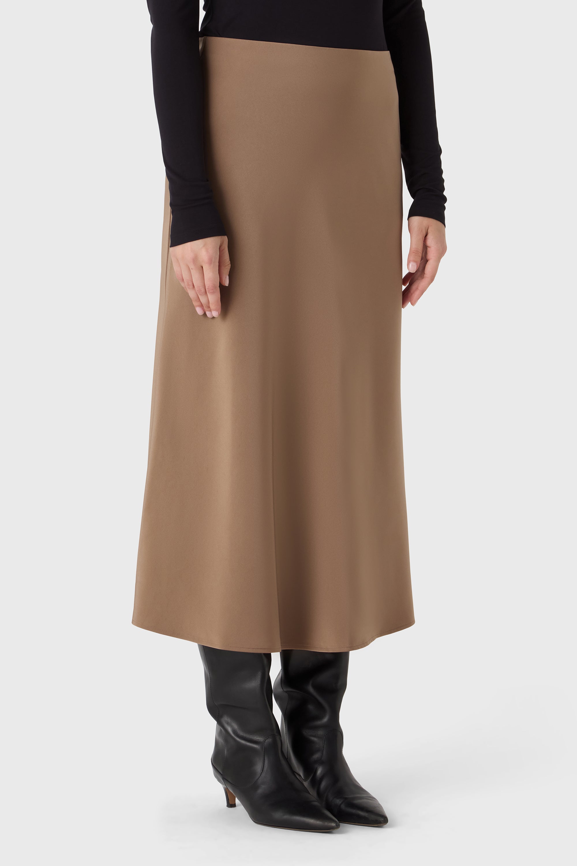 A fluid essential with quiet impact. The Ally Skirt falls to ankle length in satin stretch that flows gently around the body. The elastic waistband ensures comfort and versatility — easy to style with crisp shirts, soft knits or a matching top for a full look.