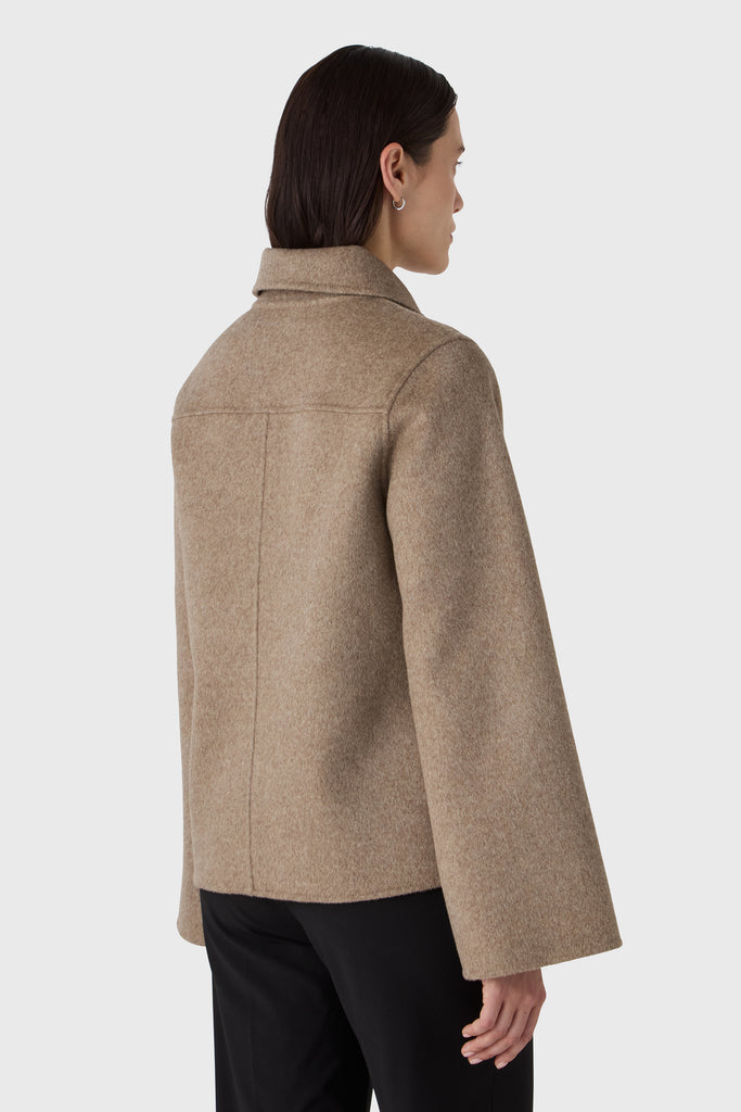 Soft structure with bold lines. The Coline Jacket is cut from 100% wool with a sculptural shape — featuring wide sleeves, a sharp shirt collar and tonal horn buttons. The cropped length balances volume and adds edge to any outfit. A modern layer for transitional dressing.