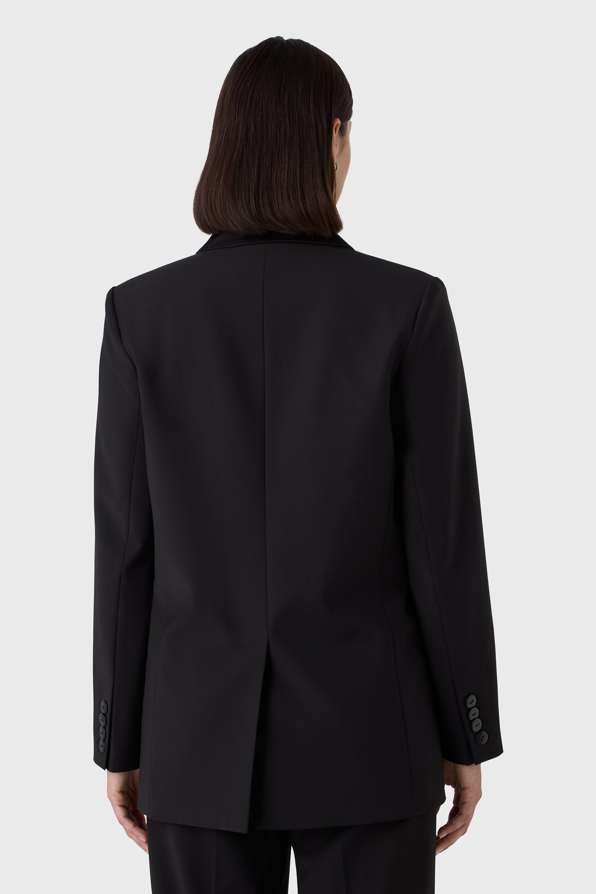 Sharp, modern and quietly dramatic. The Tuxedo Blazer is tailored in wool stretch with sleek satin lapels and a single button closure. The clean cut makes it easy to pair with matching trousers, denim or flowing satin — a statement in any combination.