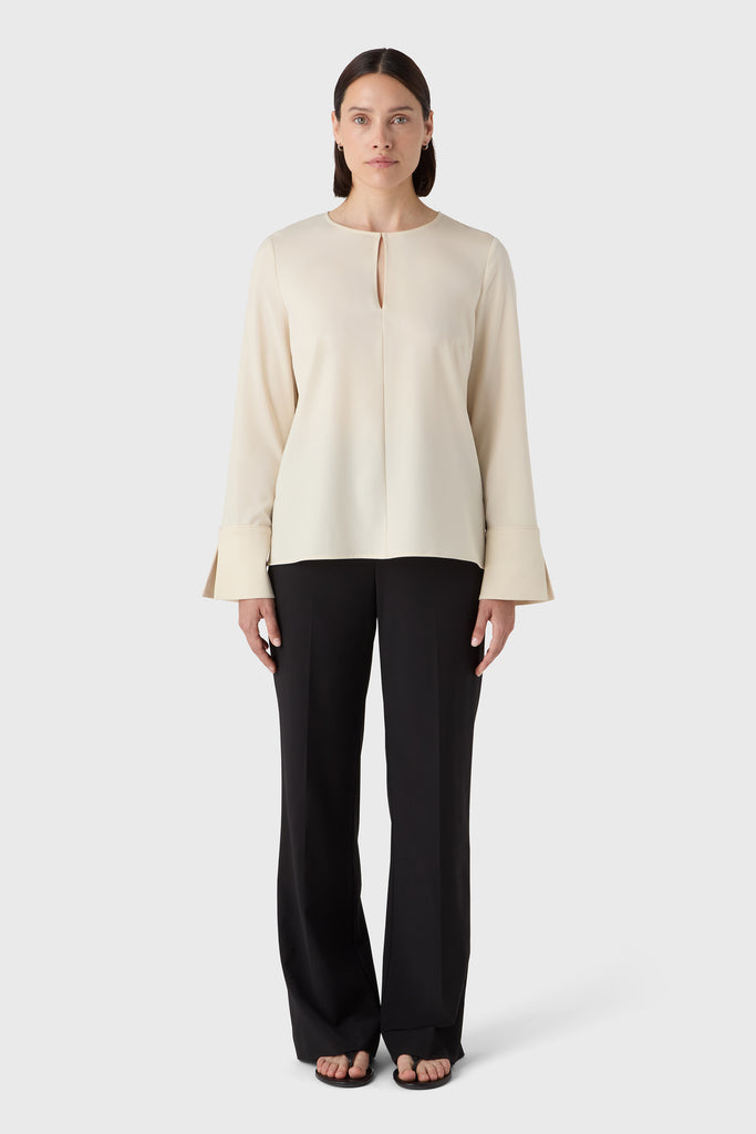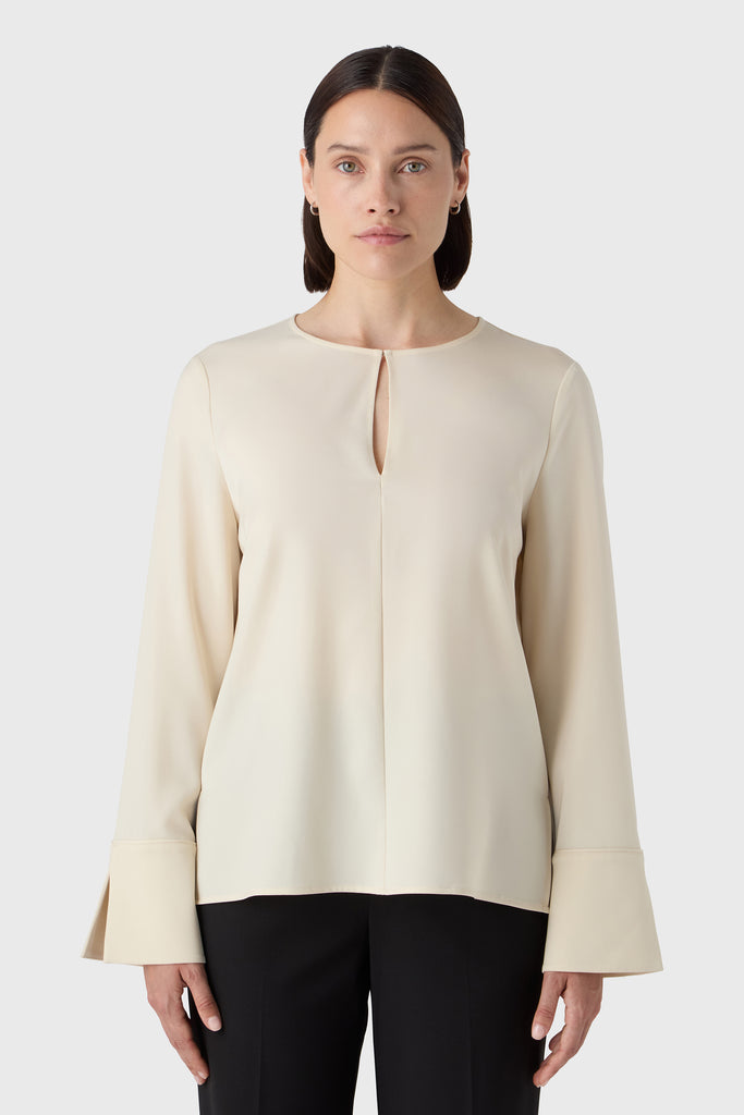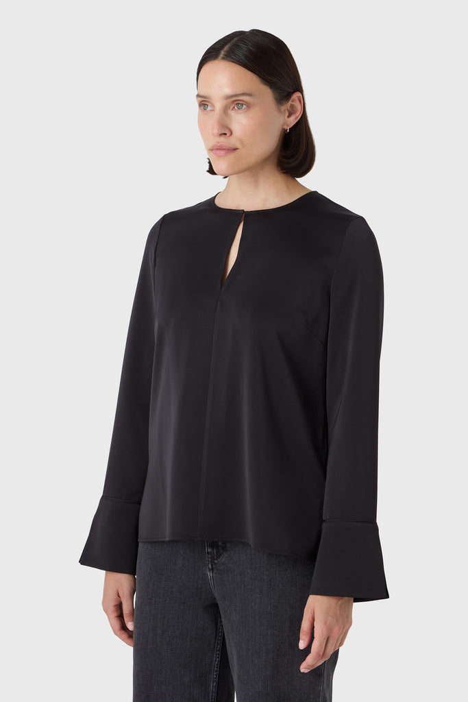 A timeless wardrobe essential with a soft twist. The Angela Blouse is cut from fluid satin stretch and features a rounded neckline with a feminine slit at the front. The subtle cuffs add a tailored finish to the relaxed silhouette, making it ideal for both professional settings and off-duty days. Tuck it into trousers or wear it loose for understated elegance.