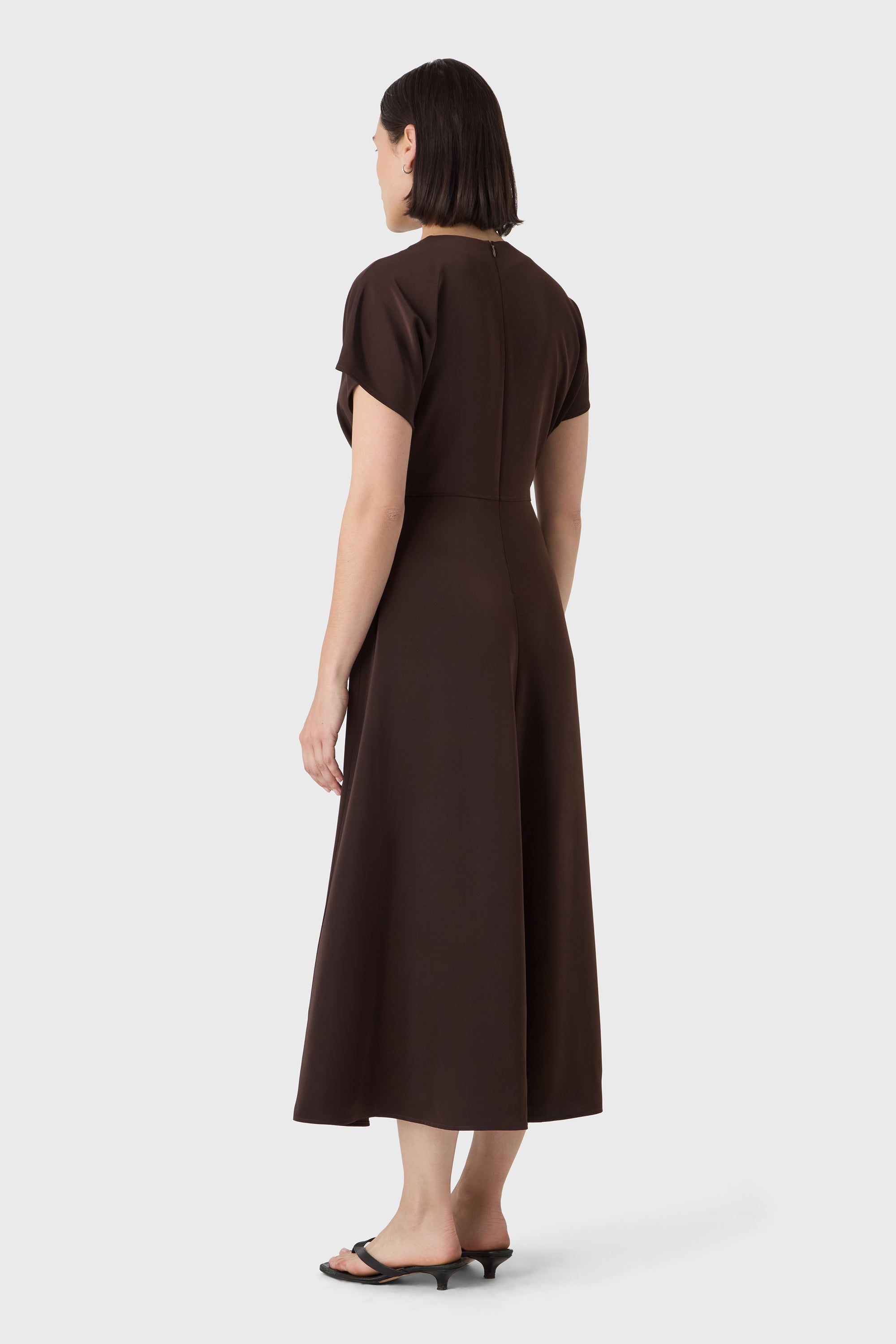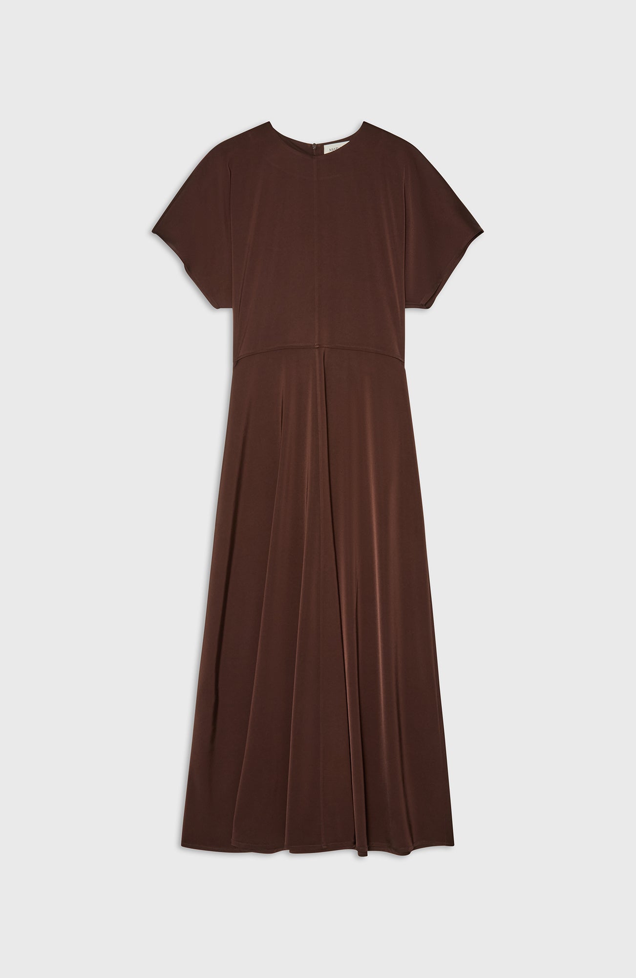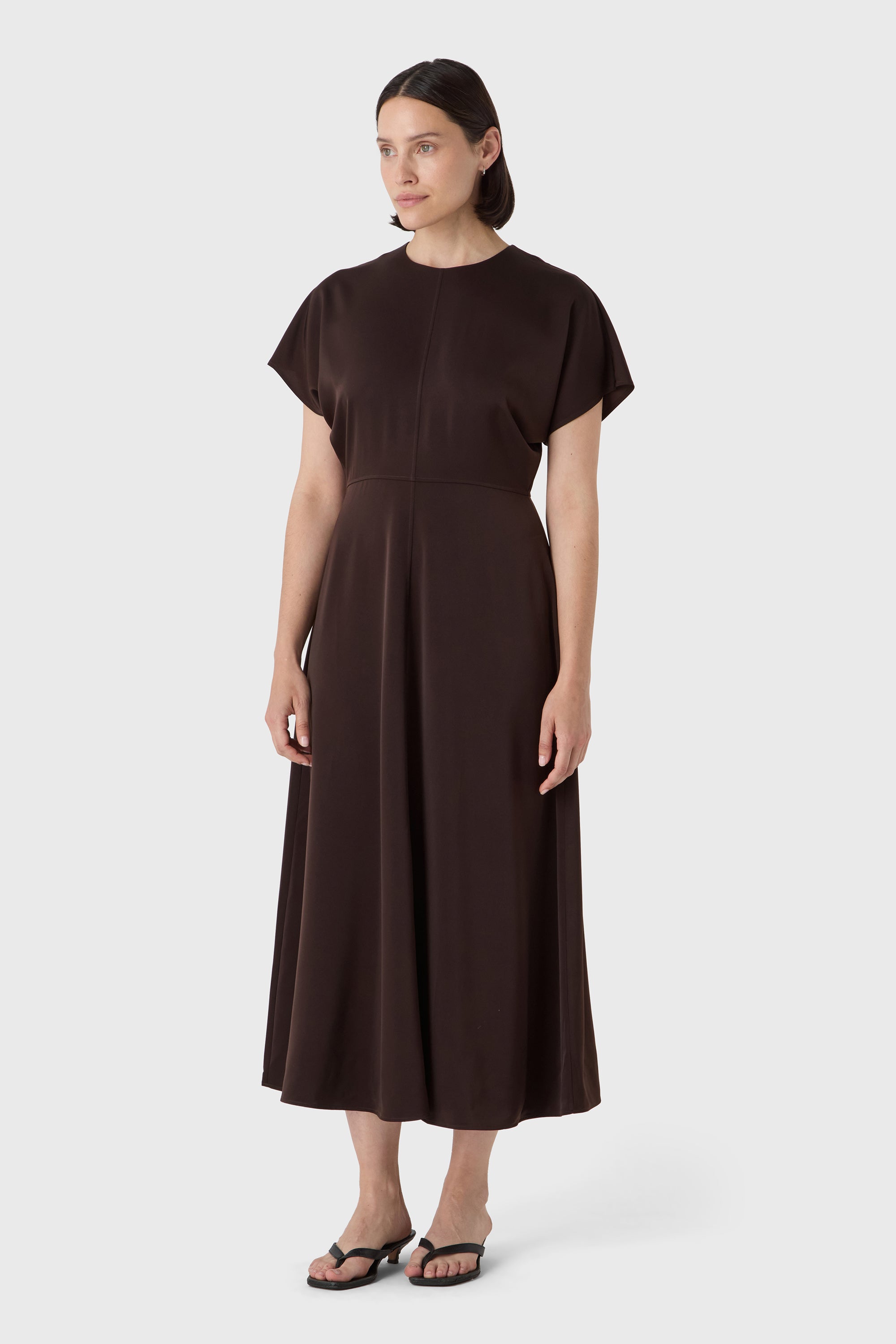 Designad för att röra sig med lätthet och elegans. Rhonda-klänningen har en mjuk rund halsringning, korta ärmar och en flödande, utsvängd kjol. Framsömmarna formar siluetten och ger en skräddarsydd känsla till den annars flytande designen. Tillverkad av satin stretch för komfort och elegans från dag till natt. Klänningen når till ankellängd.
