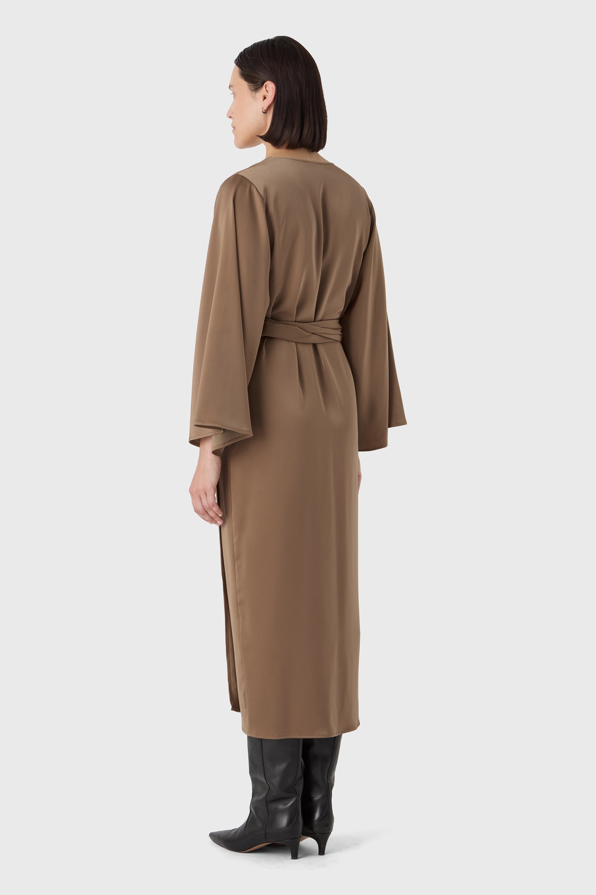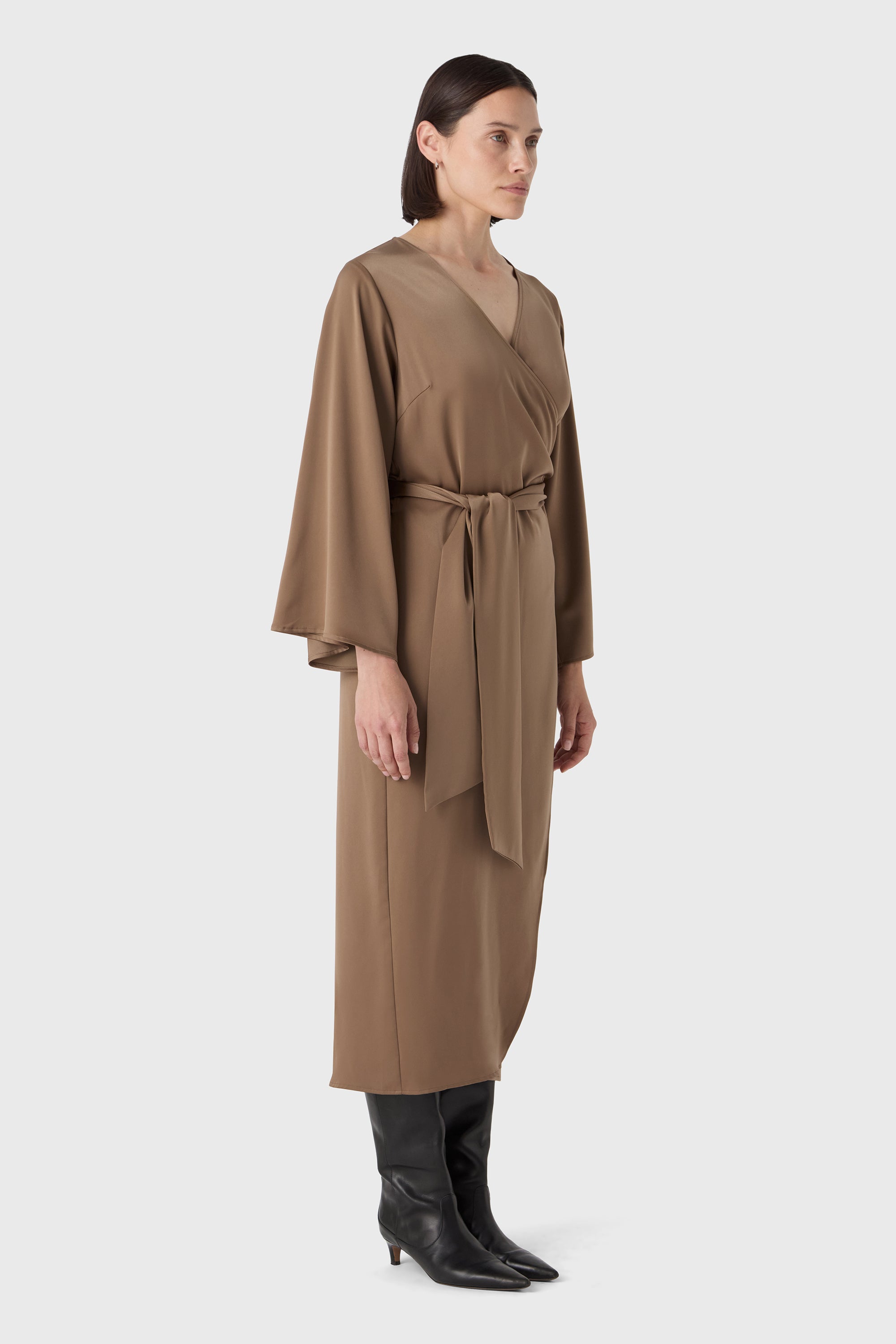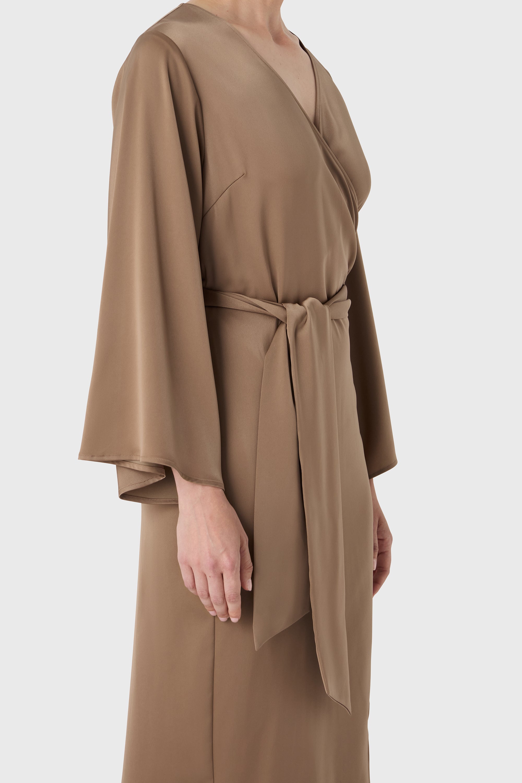 Mira-klänningen är vår signaturmodell med omlottstil – ett tidlöst plagg designat för att röra sig och andas med dig. Tillverkad av mjuk satinstretch, faller den vackert över kroppen samtidigt som den erbjuder fullständig bärkomfort. De vida ärmarna och midjebandet skapar en smickrande form som fungerar lika bra på kontoret som vid kvällsevenemang. En favoritklänning när du behöver enkel elegans.
